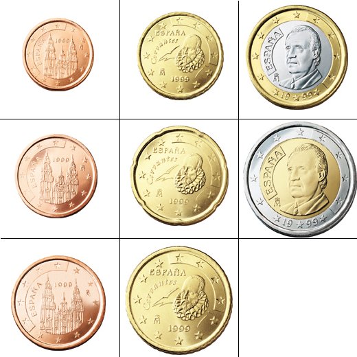 Mince v hodnote jedno a dve eurá zobrazujú portrét kráľa Juana Carlosa I. de Borbón y Borbón. Mince 10, 20 a 50 centov zachytávajú portrét otca španielskej literatúry Miguela de Cervantesa a mince v hodnote 5, 2 a 1 cent katedrálu v Santiago de Compostela.
